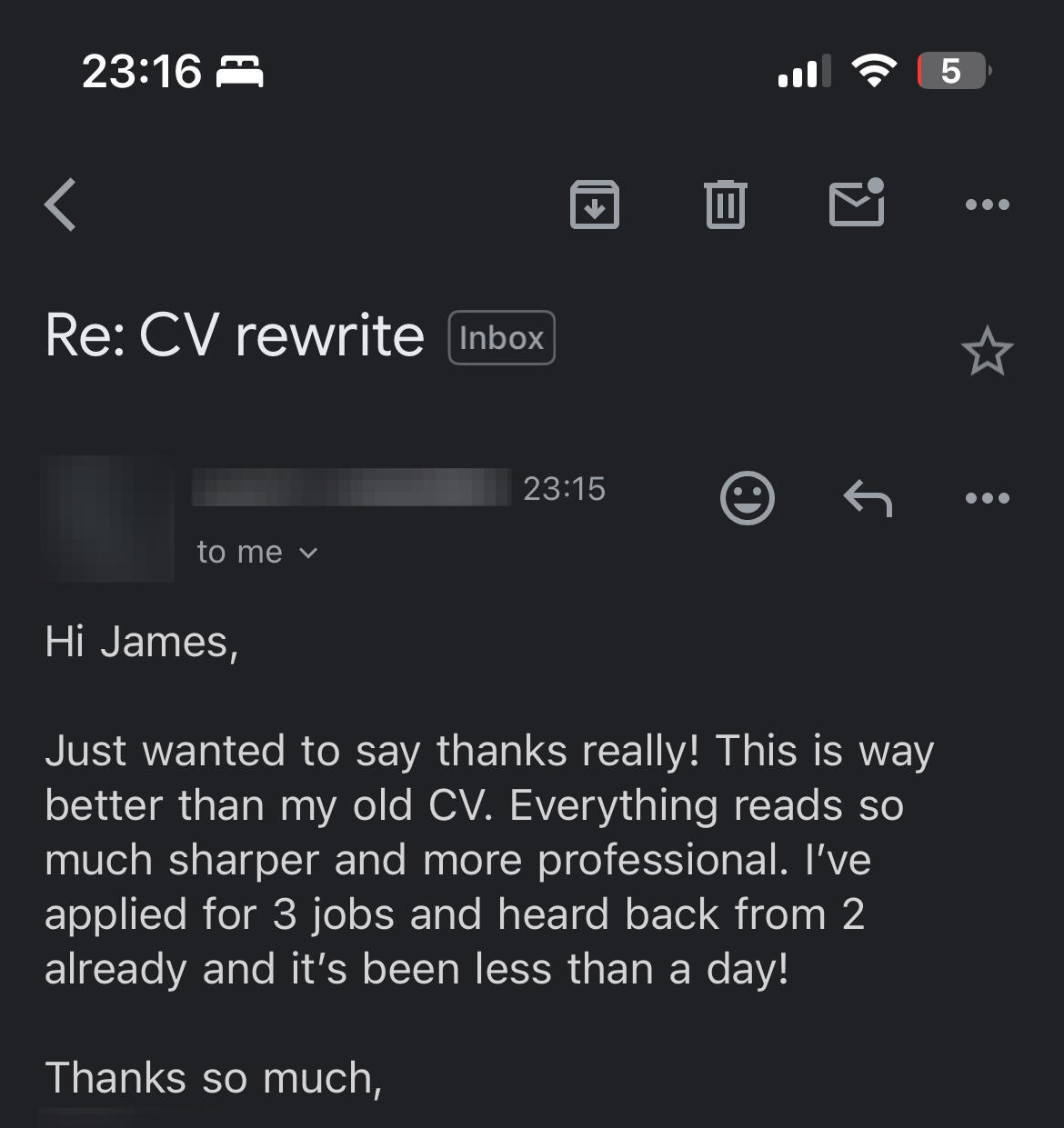 I’ll personally review your CV and show you exactly what’s working, what’s holding you back, and how to fix it - plus your ATS score.