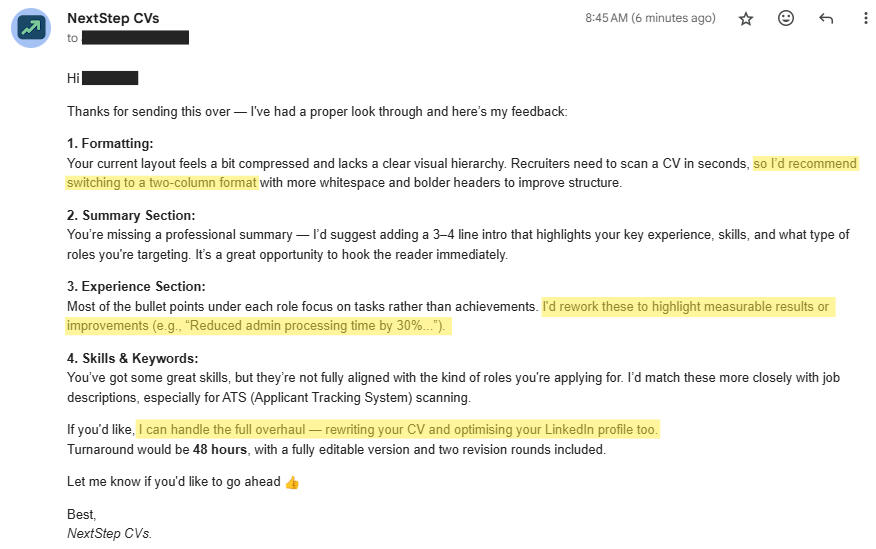 A real example of the free feedback we send after reviewing a CV — no fluff, just actionable advice.